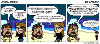 março 18, 2008 Obter link Facebook X Pinterest Email Outras aplicações Tira #3 - Jesus, Credo!Karvela Comentários Anónimo disse… um grande "props" por teres incluido a figura do comentador desportivo mais oleoso da TV, o mui espancável rui santos.Agora toca a trocar uns diálogos entre o rui santos e o mítico manuel machado.Nas palavras (que poderiam ser) do último, "não podes esbater que seria um evento envolto numa potencial grande fluidez interpretativa" Anónimo disse… mas que blog engraçado pa, parabéns!